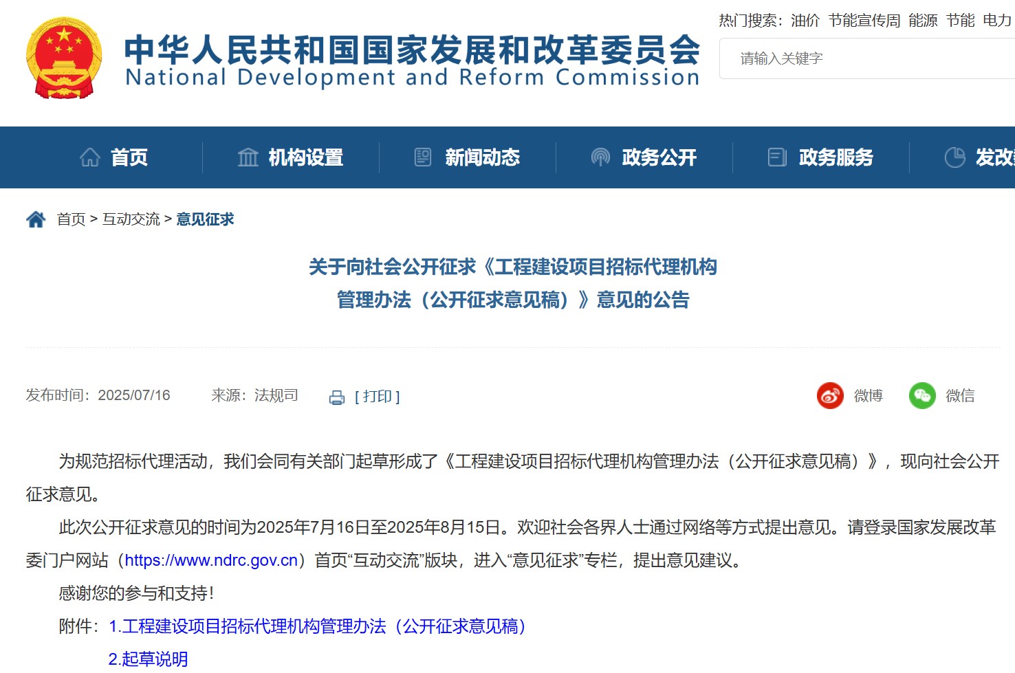 國(guó)家發(fā)展和改革委員會(huì)向社會(huì)公開(kāi)征求《工程建設(shè)項(xiàng)目招標(biāo)代理機(jī)構(gòu)管理辦法(公開(kāi)征求意見(jiàn)稿)》意見(jiàn)